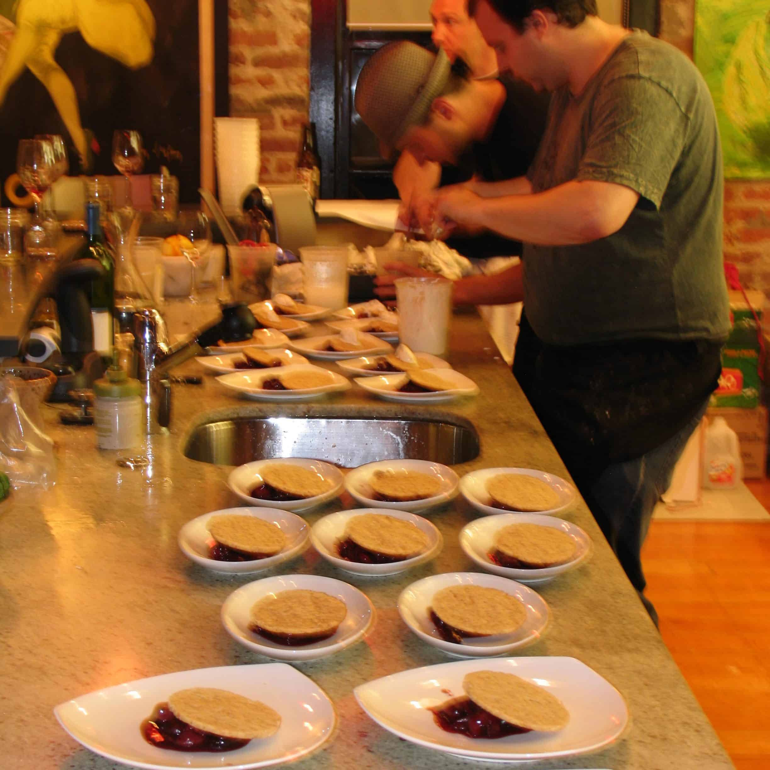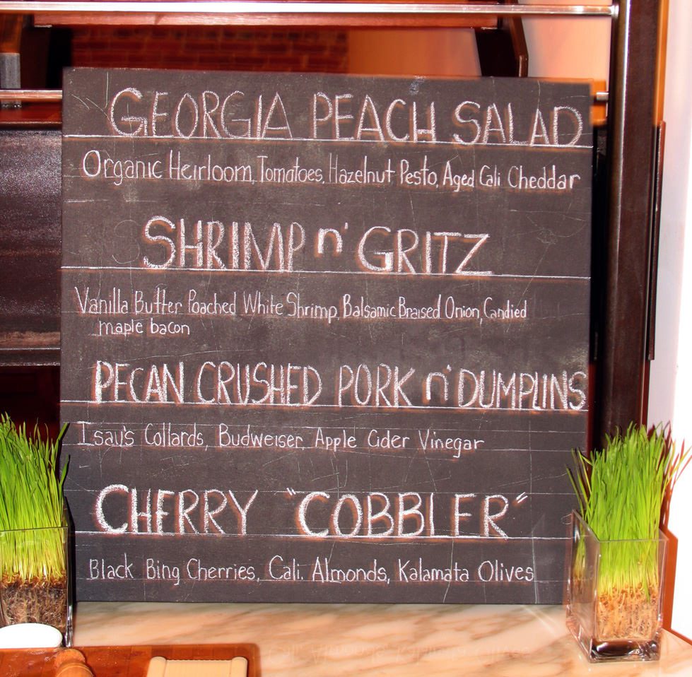For a girl pickier about tomatoes (most are gritty) and peaches (I grew up buying them fresh off the stands) than just about anyone could be, the first course of Georgia Peach Salad did not disappoint. Artfully painted in an Opal basil walnut pesto and aged white cheddar, I might timidly attempt this at home. Next up, Pecan Crusted Pork n’Dumplings—okra, collards, dumplings—such sweet words I haven’t heard since I last visited home, this dish was huge in ambition and huge in comfort. Dessert featured a cherry “cobbler” complete with Bing cherries and Kalamata olives (you read that right). When cooked down with the cherries, they produce a sweet flavor with an added kick. Admittedly biased, I would eat olives on anything.