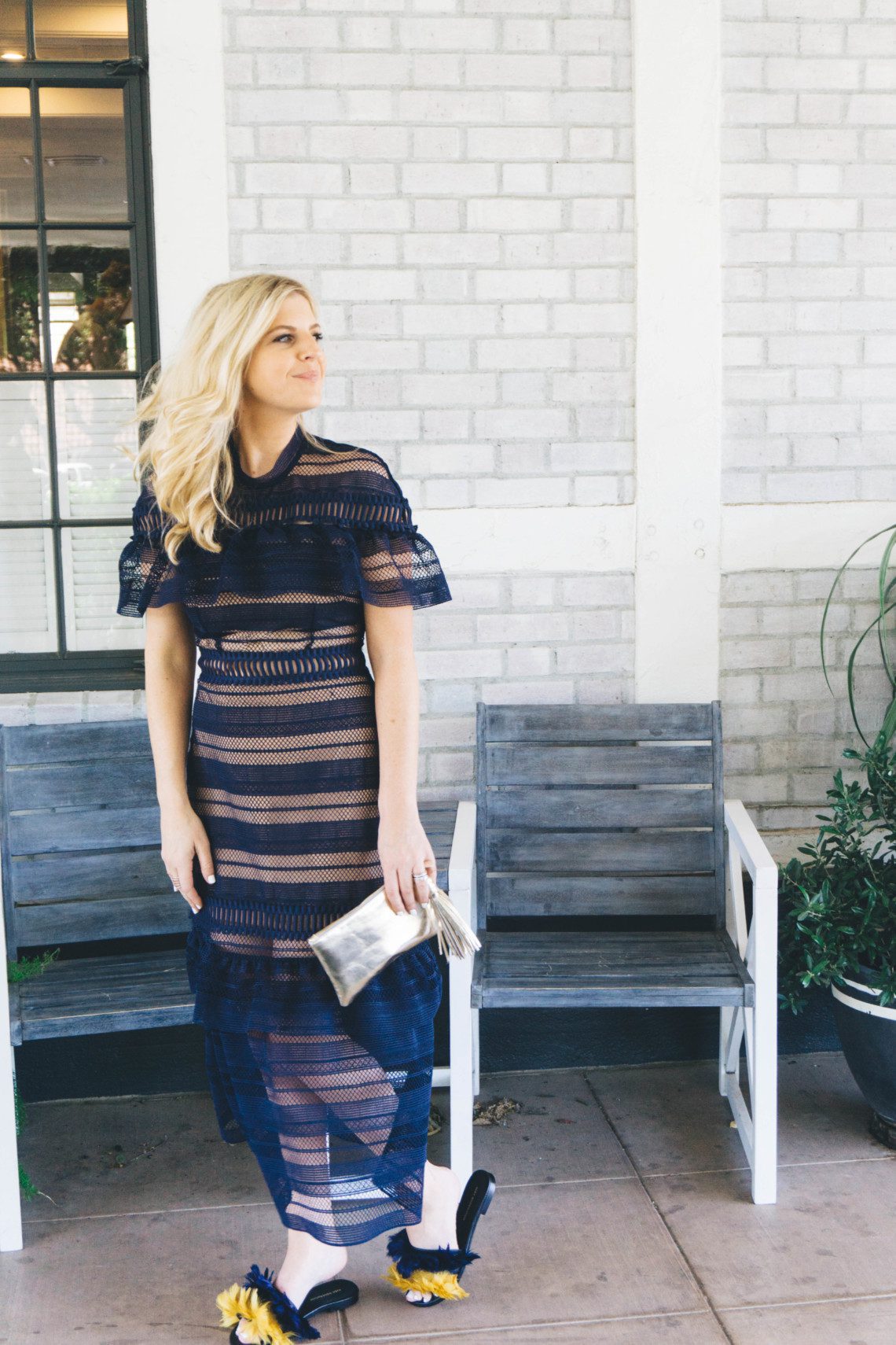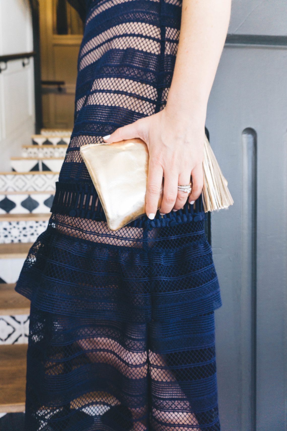 Self-Portrait Lace Midi Dress (this brand runs incredibly small. I am wearing a size 8) // Embellished Flats (on sale) // Clare V Clutch // Tassel for clutch