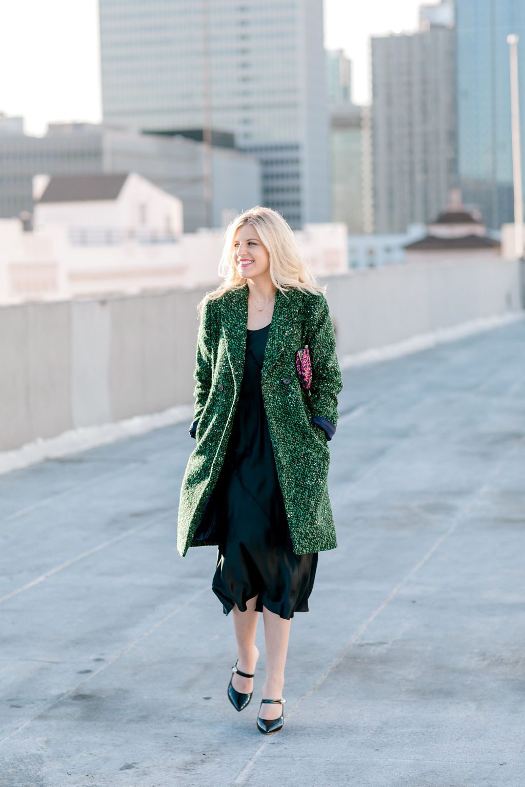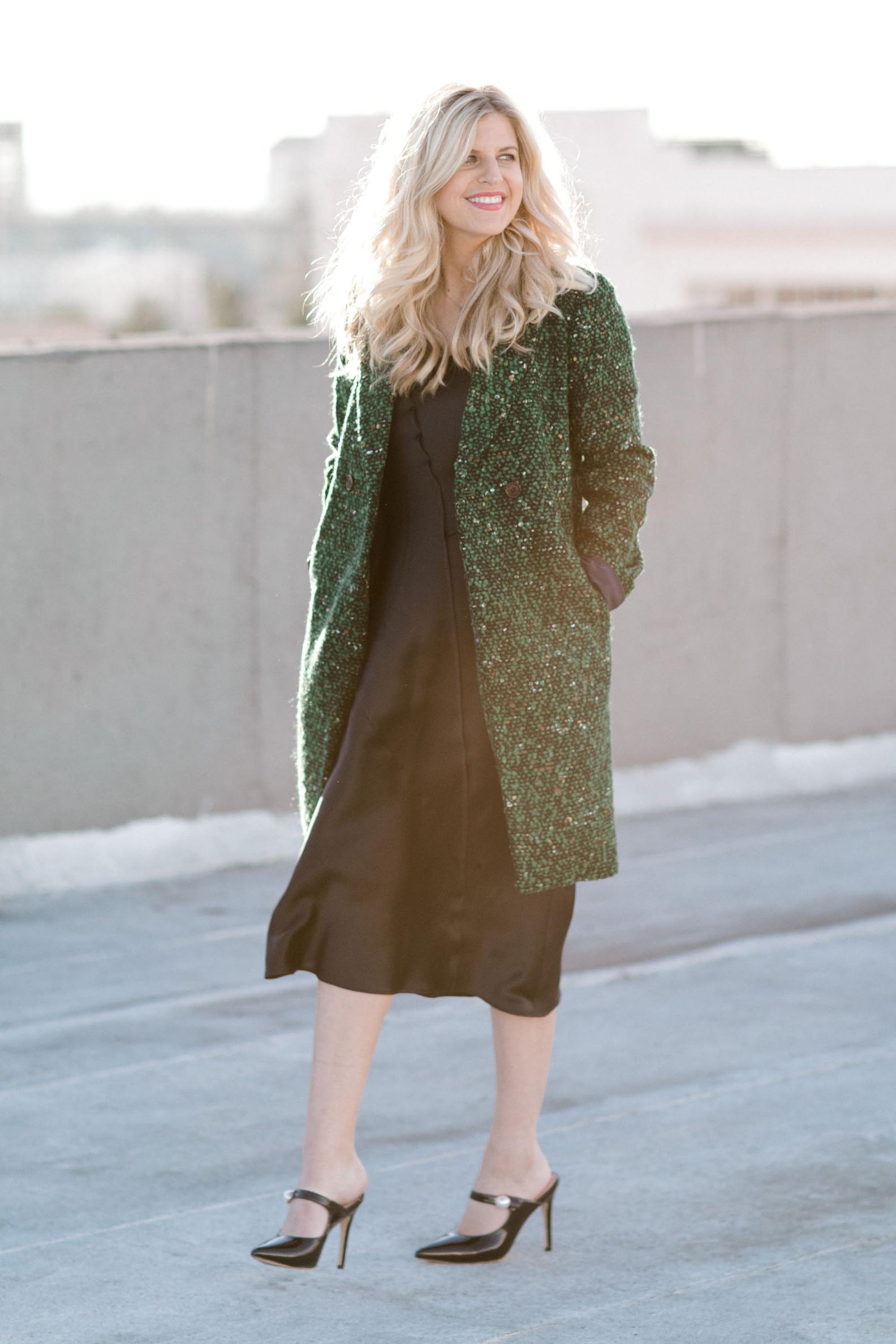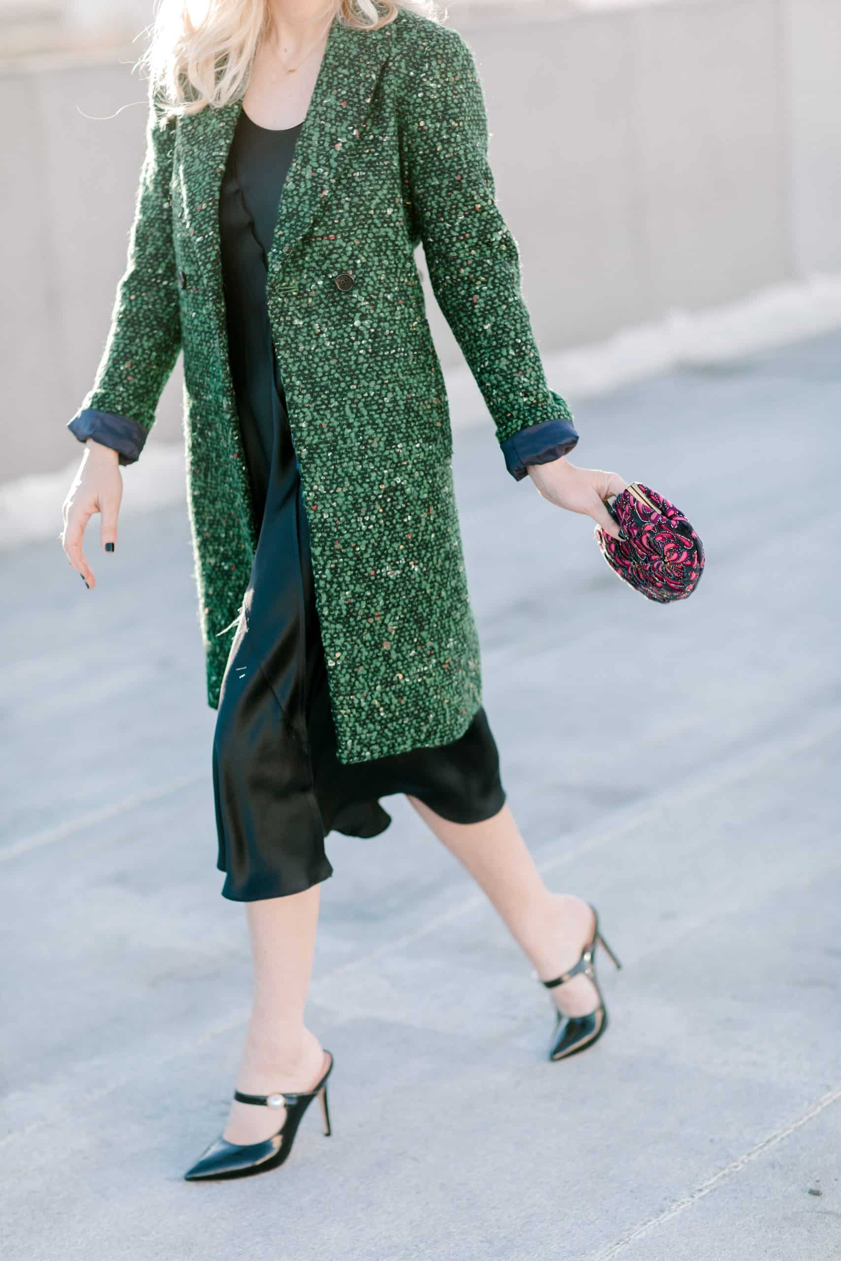 Halogen x Atlantic-Pacific Juiliana Mule // Vince Raw-Edge Silk Tank Dress in Iron // Anthropologie Beaded Clutch // J.Crew Coat// Mimi and Lu Ring (similar)